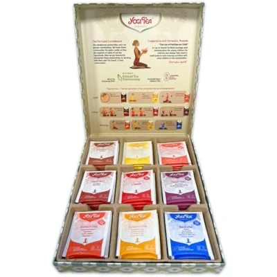 SPICE AND HERBAL TEAS: 45 teabags – a mix of 9 YOGI TEA 100% organic variations perfectly addressing every time of day: 5 Choco, 5 Ginger Lemon, 5 Heartwarming, 5 Maca Chai, 5 Classic, 5 Sweet Chai, 5 Stomach Ease, 5 Turmeric Chai & 5 Bedtime YOGA INSPIRATION: Take some me time out of your day to surround yourself with these best-selling tea blends. Start your day with our uplifting teas, then centre yourself and finally recharge for the next day DO GOOD: Yoga meets Do Good – Yogi Tea gives good to others with the Porridge Project in Rwanda. 1 box = 1 meal donation ORGANIC, ETHICAL, SUSTAINABLE: These teas are certified organic and free from flavours or additives. The shipping is CO2-neutral, the paper is FSC-certified and Yogi Tea supports social projects YOGI TEA: With their teas, a yogic wisdom on each tea tag and a yoga exercise for each tea, Yogi Tea provides inspiration to you every day and thus contributes to a more peaceful, healthy world full of mindfulness and happiness