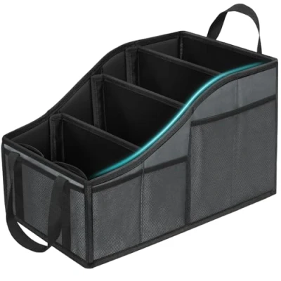 A car seat organiser for the front or back seat – multifunctional car organiser can store kids' toys, snacks, cups, tissues, books to keep kids entertained in the backseat; and essential items for driving and work are placed in the front seat, such as folders, laptops, iPads, beverages, etc; perfect for road travel and daily commuting Large storage capacity – the size of car Organiser back seat is 46 x 27 x 27 cm; interior features 3 removable dividers and 4 built-in cup holders for customizable car and cup holder storage; outside, 7 mesh pockets hold smaller driving essentials for quick access; please measure to ensure a good fit for your needs Rugged construction – the fabric is made of durable Oxford cloth, and the box body, bottom board and dividers are all supported by thickened cardboard, which makes the car boot organiser storage strong, sturdy and without deformation Take in, take out, foldable – thanks to two reinforced handles, you can easily take this car organiser back seat for kids from your car to your home or office; you can also fold it into a flat portable bag when not in use to save space Non-slip and stable design – a seatbelt strap secures car seat storage to the seat, and non-slip bottom increases friction with the seat, which helps to keep the car organiser in place while the vehicle is in motion, even braking sharply does not affect its stability