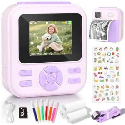 Safe & Ink-Free Thermal Printing, Instant Creativity: Child-safe thermal technology requires no ink or toner. Kids can instantly print black-and-white photos with one button and personalize them using included colored pens—turning everyday moments into unique artwork. Easy to Use, Designed for Kids: Lightweight, sturdy, and ergonomically designed for small hands. With intuitive icons, responsive buttons, and a 2.4-inch HD screen, children aged 3-12 can easily operate it alone and capture memories confidently. Long Battery & Ample Storage: A 1500mAh battery provides up to 5 hours of standby, ideal for trips and parties. Includes a 32GB memory card to store thousands of photos and videos. Shoot clear 1080p videos and zoomed shots, even in low light with the built-in flash. Fun Features for Learning & Play: Enhance photos with filters, frames, and mirror effects. Record videos, play educational games, or listen to music via the MP3 player. More than a toy—it inspires creativity, storytelling, and family interaction. Complete Gift Set, Ready to Play: Includes 3 paper rolls, 6 colored pens, a lanyard, 32GB card, USB-C cable, and stickers. Ideal for birthdays, Christmas, or surprises—encouraging kids to explore the world through their own lens and cherish childhood.