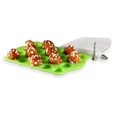 Use: Platinum Silicone Material: Silicone/Platinum Colour: Green Product description: for making delicious Cabbage salt or sugar, gougères, crackers, chouquettes, profiteroles. Dimensions: 30 x 21 x 2 cm Oven temperature: 230 °C Cleaning: dishwasher-safe