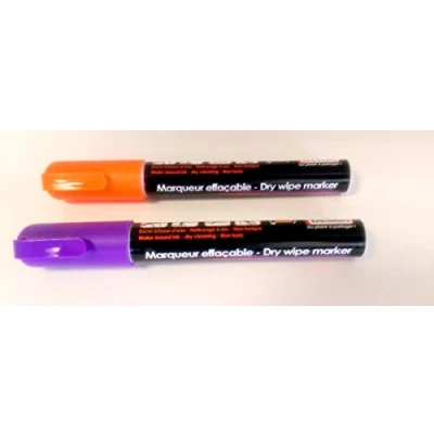 Set of 2 Markers 1 x orange marker and 1 x purple marker Completely erasable ink on glossy surface with a cloth when dry.