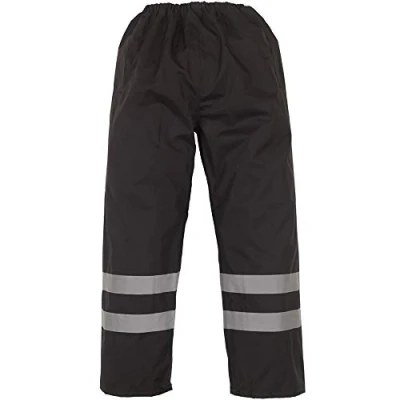 Waterproof over trousers. Open side entry access to pockets underneath. Conforms to EN471 Class 1. Black and Navy are enhanced visibility garments. Two reflective bands around lower leg.