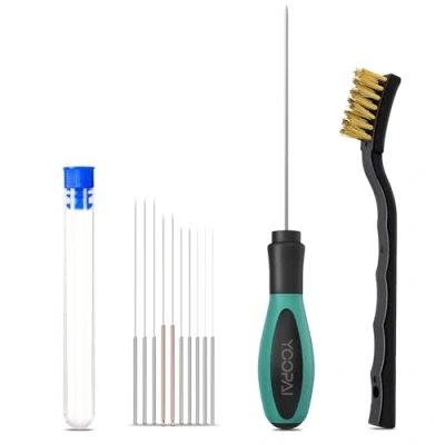 【Packaging Includes】: 1x nozzle cleaning needle with handle, 10 stainless steel nozzle cleaning needles with a storage box, and 1x copper wire cleaning brush. This kit is designed to help you easily solve all nozzle and extruder blockage issues. 【Easy to Use】: The handle is made of soft rubber material, designed ergonomically and fully compatible with the grip method, making it easier to use; The design of the arrow tip blocking the puncture matches the shape of the nozzle end, with a length of 150mm and a diameter of 1.5mm, suitable for 1.75mm 3D printing nozzles; @@@O4HFZbN7F2oFqjJXUHKJHAr/ps2q4aIt@@@ without disassembling the nozzle! 【0.4mm Nozzle Cleaning Needle】: Flexible and bendable enough, made of high-quality stainless steel, with a smooth and sharp needle tip, high strength, and good toughness. It is very suitable for removing debris from 3D printer nozzles and hard to reach areas, and is suitable for most 3D printer nozzles. 【Copper Wire Brush】: The 3D printer nozzle copper wire brush is a tool designed specifically for cleaning and maintaining 3D printer nozzles. It is made of high-quality copper wire with good thermal conductivity and wear resistance. 【3D Printer Nozzle Cleaning Kit】: The YOOPAI 3D printer nozzle cleaning kit is perfect for high-precision removal of blockages and general maintenance of heat sinks. These 3D printer nozzle cleaning kits are compatible with most 3D printers and suitable for most 3D printer nozzles. They are an essential tool for 3D printing enthusiasts and professional users.