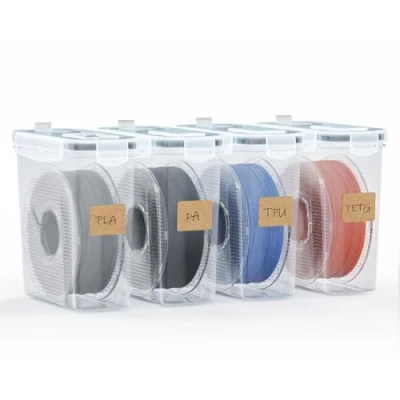 YOOPAI Filament Storage Box: Keep your 3D printing filament in pristine condition - this filament storage box prevents exposure to water,dust,moisture.This kit include: 50g desiccant *8, filament container*4, labels*18 Innovative Design: In order to enhance the sealing ability of these filament storage containers for pantry, we added a silicon seal around the opening of the flip lid Universal Compatibility: This 3d printer filament storage box is designed to fit nearly all standard 1.75mm filament spools on the market, making it the perfect choice for most 3D printing enthusiasts. Whether you use PLA, ABS, PETG, TPU, or other popular materials, this container securely holds 1KG spools with ease Space Saving and Transparent Design: Potable design for saving space in your home or office,you can handle it anywhere.Transparent design, you can see the filament's color without opening the box Worry Free & Lifetime Technical Support: Feel free to contact us any time in need and we promise we will do our best to help you to solute your problem