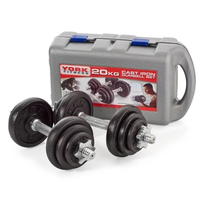 The York 20kg Cast Iron Dumbbell Set includes 2 x 14” chrome spinlock dumbbell bars, 4 x chrome spinlock collars and 12 cast iron weight plates (4 x 0.5kg, 4 x 1.25kg, 4 x 2.5kg).. The dumbbell bars feature central knurling to ensure a secure and comfortable grip. The spinlock design makes plate changes quick and easy while the heavy duty spinlock collars safely secure the plates.. The set includes a handy workout guide and carry case for storage.