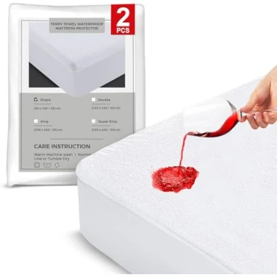 ULTIMATE WATERPROOF PROTECTION: Our mattress protector features a waterproof TPU backing that guards against spills, stains, and moisture, extending the life of your mattress. Perfect for families with kids or pets, it ensures your mattress stays perfect and dry. BREATHABLE AND SOFT: Made from 100% Polyester terry surface, our mattress protector offers exceptional breathability and softness. It helps regulate body temperature, keeping you cool in summer and warm in winter for a restful night's sleep. COMFORTABLY NOISELESS: The soft cotton terry surface allows air and heat to flow freely, providing a quiet, breathable, and comfortable sleeping experience. The flexible, high-quality waterproof membrane ensures no crinkly noises disturb your sleep. EASY FIT WITH DEEP POCKETS: Designed with a Corner elastic skirt made of durable mesh fabric, our mattress protector fits mattresses from 25cm to 30cm deep. This ensures a secure, snug fit, preventing any shifting or bunching during the night for consistent comfort. ENHANCED DURABILITY: Constructed with premium materials, this mattress protector is designed to withstand daily wear and tear. It's machine washable, do not tumble dry, making it simple to maintain a clean and hygienic sleeping environment, perfect for busy households.