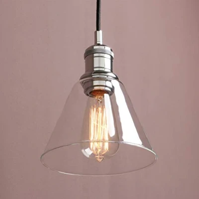 Modest, mighty, modern. A vintage industrial style ceiling pendant light with an antique suspension and high-class clear glass shade Light shade: 18.5cm/7.3”, Ceiling Rose diameter: 12cm/4.7”, Black cord wire is 200cm/78.7”, the wire can be shortened at the point of installation for use in rooms with lower ceilings Suitable for E27 SCREW Light bulbs, LED bulbs Or Incandescent bulbs (NOT include any Light bulbs) This ceiling pendant light is suitable for use with a normal wall switch or dimmer switch providing the bulb used is also dimmable Clear the way for this graceful cone shaped glass pendant light to add a real simple look to kitchens, bars, and hallways etc etc