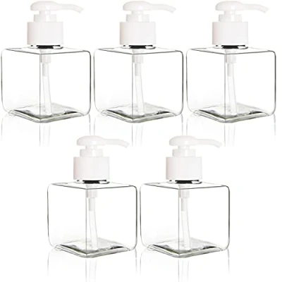 Pump Bottle Dispensers GREAT VALUE - 5 Pack Clear Plastic Square Pump Bottle Dispensers (250ml). MULTI-USE - Use for Shampoo, Body Wash, Conditioner, Liquid Soap, Dish Soap, Lotion, Mouthwash, Massage Oils, food ingredients and much more SAFE - NO BPA, NO LEAD. ECO-FRIENDLY - Reuse our pump bottles. It's easy and eco-friendly. And you help reduce disposal of plastic bottles. This is a recommended tip to live a Zero Waste Lifestyle. LOCKABLE PUMPS - Pump locks for easy closure for transport or storage.
