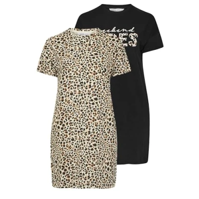 Add a trending print into your nightwear collection with these must-have nightdresses. Made from a cool cotton fabric, they feature a 'weekend vibes' slogan and a leopard print design, short sleeves, a crew neckline, and are complete in an oversized fit. Style with slippers for a cosy night in look! Yours Clothing is a British based brand, and the go-to destination for the latest on-trend plus size clothing designed to fit curves in UK sizes 14-40. We lead the way when it comes to plus size clothing that fits and flatters, making fashion that fits and not fashion to fit into. Short sleeves and an oversized fit. Length from (approx): 104cm/40.9" Plus size 2 pack leopard print night dresses. Model is 5' 9.5" / 176.53 cm and size UK 16/EU 44. You can never have too many pyjamas!