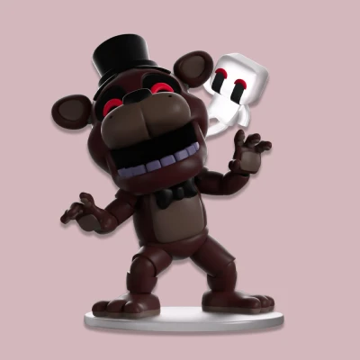 Standing at 4.3 inches tall, the EXCLUSIVE FNAF Dark Haunted Freddy Youtooz Figure captures pure dread with meticulous detail. Freddy's arms are outstretched in terror, and his large open mouth reveals a row of bright white teeth. His raised eyebrows and blue pupils shine out from black sockets, while a clear ghost wraps around his head, complete with tear marks and a black top hat. The packaging enhances the figure's spooky charm, featuring a ghost escaping from Freddy down a long hallway on the exterior. Inside, the same ghost is depicted flying through the vent of the security room. The protective sleeve shows a close-up of the pizzeria's wall and displays Freddy through a large clear window. This collectible ships with a matte, embossed outer sleeve and a custom-sized plastic protector for maximum protection. Youtooz collaborated with FNAF Fanverse game creator Kane Carter in developing the Haunted Collection, ensuring authenticity and attention to detail. Perfect for any FNAF fan, the Haunted Freddy figure is a must-have addition to your collection, blending intricate design with the eerie essence of the beloved game series.