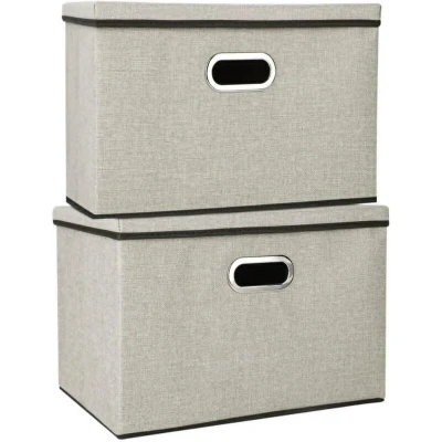 General description The Youyijia 2 Pack Storage Boxes with Lids are versatile and stylish storage solutions designed to help you organize your space efficiently. Made from durable linen fabric, these collapsible storage baskets are perfect for storing a variety of items, including clothes, toys, and books. The boxes can be easily folded when not in use, maximizing your storage space. Technical specifications Dimensions (unfolded): 45 x 30 x 30 cm Material: Linen fabric (outer), non-woven fabric (inner) Color options: Beige, Gray, Brown, Pink, Green Features: Lidded, Foldable Usage Ideal for storing clothes, socks, CDs, underwear, leggings, yoga pants, scarves, off-season clothing, blankets, hats, books, toys, shoes, etc. Can be placed in closets, bookshelves, children's rooms, bedrooms, nurseries, offices, and playrooms. Other information Includes 2 multifunctional storage boxes. Handles on both sides for easy carrying. Not washable; clean with a soft cloth if dirty.
