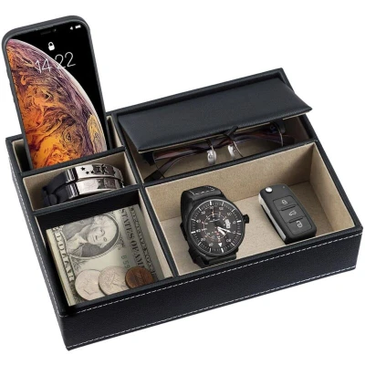ManoManoGeneral description Keep your essentials organized in style with our premium valet tray! This sleek PU leather valet tray offers 5 intelligently designed compartments to store all your daily essentials neatly and accessibly, ensuring you never misplace your phone, wallet, or keys again. Technical specifications Size: 18.7 cm (D) x 26 cm (W) x 5.3 cm Color: Black/Grey Material: Premium Faux Leather + Velvet Compatibility and accessories Package Included: 1x Organiser Tray