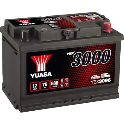 SPECIFICATIONS: 12V SMF High performance Battery; Capacity: 76 Ah; Startup Power (CCA): 680 Amps; Size (mm): 278 x 175 x 190; Weight (kg): 18; Brass terminals (Type 1) to enhance conductivity and optimise overall battery performance. UP TO 30,000 ENGINE STARTS: Designed to last, the Yuasa YBX3096 offers up to 30,000 engine starts, ensuring long-lasting reliability and consistent performance. WIDELY COMPATIBLE: The Yuasa YBX3096 ensures reliable operation across various driving conditions and is compatible with various vehicle makes such as: Volkswagen, BMW, Audi, Citroën ,Ford & many more SUITED FOR STANDARD POWER DEMANDS: Ideal for vehicles with standard power needs, providing dependable power for everyday driving. VIBRATION AND SHOCK RESISTANT: Constructed to withstand vibrations and shocks, the Yuasa YBX3096 ensures reliable operation across various driving conditions, making it ideal for a wide range of vehicle applications.