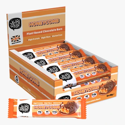 YuBi Bar Honeycomb Protein Bar (12 x 35g) is a plant-based, gluten-free, low-calorie snack packed with 10.5g of protein per bar, featuring a delicious honeycomb and dark chocolate flavor—perfect for nutritious, on-the-go snacking. Contains SOYA; suitable for various dietary preferences.