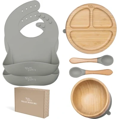 Yum Yum's Set of 6, Baby Feeding Set, Plates with Suction, Bamboo Plates, Bowl & Wooden Spoons Weaning Suction and Plate,Baby Bibs, for Kids