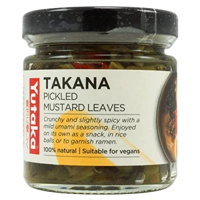 CRUNCHY & FLAVOURFUL - Yutaka Takana Pickled Mustard Leaves offer a crunchy texture with a gentle spicy kick and mild umami seasoning, delivering a bold yet balanced flavour perfect as a snack or with meals. PERFECT FOR RICE & RAMEN - Enjoy as a tasty addition to steamed rice, onigiri (rice balls), or as a vibrant garnish for ramen and noodle dishes, enhancing traditional meals with fresh, crunchy flavour. JAPANESE STYLE PICKLE - This Japanese-style pickled mustard leaf is a well-loved side dish that also works perfectly as a filling for onigiri and sandwiches, or enjoyed on its own as a delicious snack. 100% NATURAL & VEGAN-FRIENDLY - Made from all-natural ingredients, Yutaka Takana Pickled Mustard Leaves are suitable for vegans and ready to enjoy straight from the pack with no preparation needed. TRUE TASTE OF JAPAN - Yutaka means “good harvest.” Explore the rich variety of Japanese cuisine with our authentic ingredients, inspiring recipes, and bold flavours to discover at every meal.