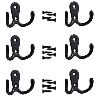 YuZhou 6 PCS Double Prong Robe Hooks, Dual Coat Hooks Black Door Chrome Hook Cloth Hanger Hangers Metal Towel Bathroom for Bedrooms Screw in Hanging
