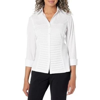 Zac & Rachel Women's 3/4 Cuff Sleeve Button Down Top with Ribbed Knit Inserts for a Comfortable Fit Blouse, White, Large