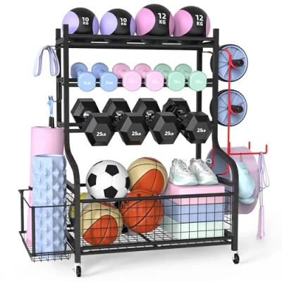 ZACHVO Dumbbell Rack Home Gym Storage Weight with 360 Wheels, 8 Hooks, Yoga Mat & Equipment Storage, Space Saving Fitness Organiser for Dumbbells, Kettlebells, Blocks More