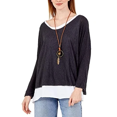 Zaif & Hari New Women's Ladies Italian Fine Knit Long Sleeve Glitter Trim 2 in 1 Necklace Top Blouse (12 14, Black)