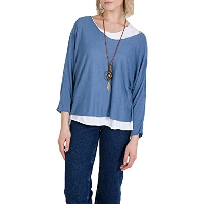 Zaif & Hari New Women's Ladies Italian Fine Knit Long Sleeve Glitter Trim 2 in 1 Necklace Top Blouse (12 14, Denim Blue)