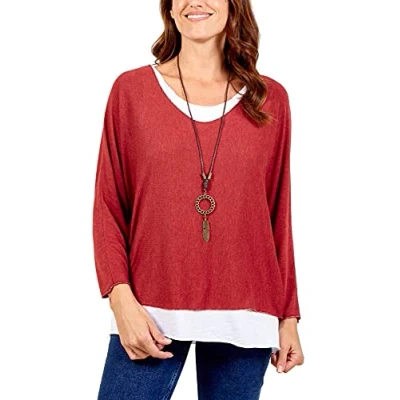 Zaif & Hari New Women's Ladies Italian Fine Knit Long Sleeve Glitter Trim 2 in 1 Necklace Top Blouse (8 10, Red)