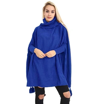 Zaif & Hari Women Ladies Hi Neck Batwing Tassels Poncho Fine Knitted Winter Shawl Jumper Top One Size Fits 10 28 (One 8 28, Royal Blue)