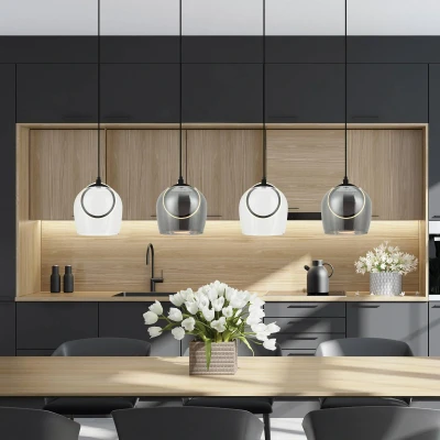 Lighting concept for dining rooms: LED pendant light 23082 with integrated light source The LED pendant light 23082 transforms dining areas into inspiring and cosy rooms. The 4-bulb light with high-quality glass elements not only offers an appealing look, but also an energy-efficient lighting solution. The integrated LEDs create a pleasant atmosphere for dining and socialising while minimising energy consumption. Ideal for the dining room, this light creates a lighting experience that both lifts the mood and supports the room in its function - Colour of lampshades: 2 x clear, 2 x smoky grey