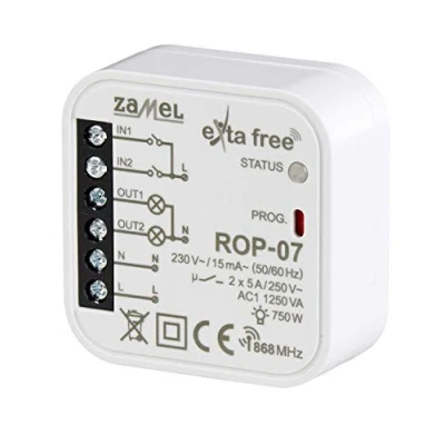 The flush-mounted receiver ROP-07 works with the wireless Exta Free system transmitters. It is used to control electrical appliances. External inclusions are designed for use with conventional switches. ROP-07 is a radio receiver of the Exta Free System, which is characterised by high energy efficiency. The device is designed for continuous operation thanks to its low power consumption and is powered by 230 V AC. The ROP-07 flush-mounted receiver can be configured in one of five operating modes: on, off, monostable, bistable and time-delayed mode. One device offers you many possibilities. The device can be easily installed in Ø 60 mm installation boxes (flush-mounted and surface-mounted) as well as directly into light housing as devices. Very easy to assemble ROP-07 is characterised by a long range of up to 250 m in open terrain. It is possible to increase the range with the RTN-01 retransmitter available in the Exta Free system, so that we can customise the device to our own needs., Weight: 0.0881849048 Pounds, Manufacturer: Zamel Sp. Z o.o.
