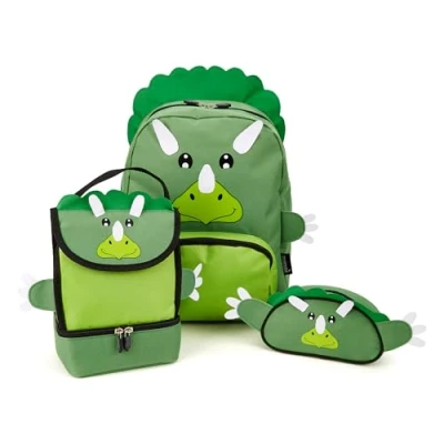 Back-to-School Essential: Equip your child for school with our Zappi Co Triceratops Backpack set. This complete package includes a backpack, lunch bag, and pencil case, all featuring a dynamic Triceratops theme. Ideal for any dinosaur enthusiast ready to charge into the school year. Roomy Triceratops-Themed Backpack: Our backpack showcases a striking Triceratops design, providing ample space for all school essentials. Measuring H38 x W30 x D9 cm when full, it's perfect for carrying everything from A4-sized papers to larger items. Insulated Triceratops Lunch Bag for Fresh Meals: Keep your child's meals fresh and cool with our matching Triceratops lunch bag. The insulated and water-resistant features ensure food stays tasty all day long. The lunch bag measures H22 x W17 x D12 cm, offering plenty of space for a meal and a beverage. Triceratops Pencil Case for Fun Learning: This set includes a Triceratops-themed pencil case, ideal for storing all writing implements and small accessories. With dimensions of 19 x 10 x 6cm, it provides ample space for all their educational tools. Comfort and Durability for Everyday Use: Crafted for daily use, the Triceratops backpack set is equipped with a padded back and adjustable straps for optimal comfort, while robust stitching ensures it can withstand the rigors of the school year. Prepare your child to tackle new challenges with prehistoric power!