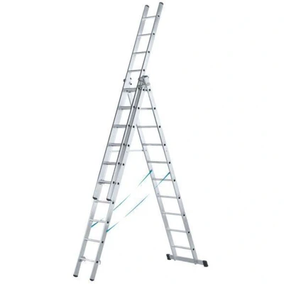 General description This Zarges Skymaster™ Trade Combination Ladder is a versatile tool that functions as six different ladders in one. It can be used as a single, double, or triple extension ladder, a trestle step, an ‘A’ frame ladder, and is suitable for use on steps and stairs. The ladder is designed for durability and safety, featuring lockable sections and anti-splay straps. Technical specifications Number of Rungs: 3 x 9 Ladder Length: 3-Part Single Ladder: 6.7m 2-Part Single Ladder/Stepladder with Push-On Section: 4.7m Closed Length: 2.7m Stabiliser Bar Width: 1.1m Weight: 20kg Rated for 150kg Other information All sizes conform to EN131 professional standards. Includes a 10-year guarantee. Features a wall wheel assembly at the top of the upper section. Rung locks are bolted in for easy replacement. Replaceable 2-component plastic end caps for stability. Extra wide stabiliser bar included on the bottom section.