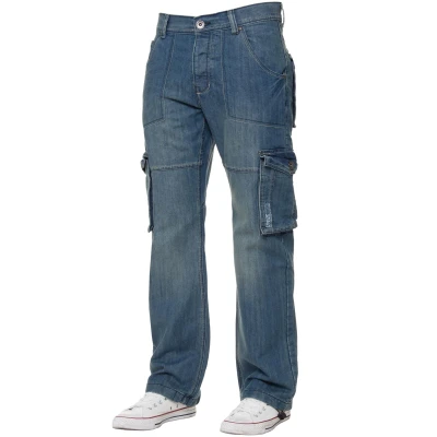 Kruze Mens Designer Cargo Combat Multi Pocket Denim Jeans. 7 Pockets Including Coin, Side Pockets. Back and Side Pockets are Secured with Button Fastening. Contrast Stitching, Adjustable Cinch to the Back. Adjustable Toggle to the Hems. Ideal for Casual and Work Wear. Button Fly Fastening. Branded Buttons and Rivets.