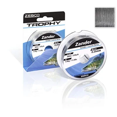 Diameter 0.25 mm Length: 300 m 328 yds 5.0 kg / 11.0 lbs grey The second generation of trophy cords with attractive packaging and new manufacturing technology, which takes all the important features of monofilament cord to a new level. Soft, supple and knot-resistant is the first commitment when catching the shy zander. Thanks to the best abrasion resistance, zander can be safely fished without a Kevlar leader.