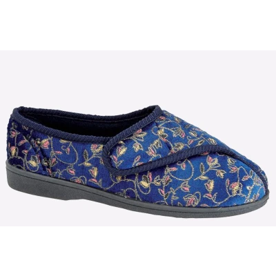Boasting a navy upper with stylish gold flower detailing, these Zedzzz women's slippers are a stylish choice when it comes to comfortable wear around the house. - Velour upper - Touch fastening closure - Washable - Vulcanised Rubber Sole