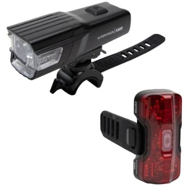 This enables you to ride with confidence in daylight or in low-light conditions. It is specially designed for cyclists looking for maximum visibility and increased safety when riding in the city or on a tour.Easy to install and remove thanks to its adjustable mounting bracket, it is IPX 6 certified, making it water impact resistant and safe from high pressure water from any angle. Its central button makes it easy to use, with quick access to the different setting modes.This light has 4 operating modes 2 continuous modes and 2 flashing modes. Its long battery life means you'll always be able to see and be seen.This light can be recharged via a USB-C port (Cable not included)Front 4 Adjustable light settingsContinuous Low: 4hrs lifeContinuous High: 2hrs lifeFlash 1: 86hrs lifeFlash 2: 18hrs lifeRear 5 Adjustable light settingsContinuous Low: 16hrs lifeContinuous Medium: 5.5hrs lifeContinuous High: 3hrs lifeFlash 1: 16hrs lifeFlash 2: 8hrs lifeWhat's in the box?Supervision F200 Front LightSupervision R150 Rear LightX1 Handlebar Bracket