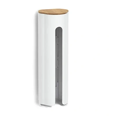 Modern cotton pad dispenser with bamboo lid Material: ABS/bamboo Colour: white Approx. 8 x 6.5 x 25 cm Mounting kit with screws and tape included With lid made from sustainable bamboo Same look cotton swab dispenser available