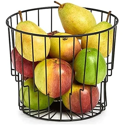Cylindrical basket for storing fruit and vegetables. Material: metal. Colour: black. Approx. Diameter 24 x 9.5 cm. Made of powder-coated metal.