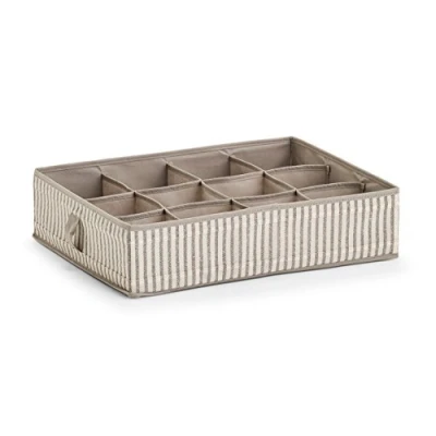 Practical storage box with 12 compartments Material: non-woven Foldable thanks to zip on the base Cardboard side reinforcement provides stability Dimensions: approx. 44 x 34 x 11 cm