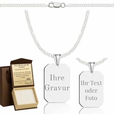 Robust mariner link necklace made of 925 sterling silver - high-quality men's necklace with classic mariner link (also called anchor link) style, 2.6 mm wide, made of solid 925 silver - elegant jewellery with pendant for men. Sizes and weights for a perfect fit. Available lengths: 45 cm (approx. 3.5 g), 50 cm (approx. 3.7 g), 55 cm (approx. 4.3 g) and 60 cm (approx. 5.5 g); dog tag pendant approx. 6.5 g (dimensions approx. 3.5 x 2.5 cm) – Custom men's necklace with engraving pendant. Engravable dog tag pendant - solid dog tag pendant made of 925 silver with double-sided surface for engraving: name, date or short message - perfect personalised necklace for men. Suitable for everyday use and skin-friendly: the necklace for men made of 925 silver is nickel-free and hypoallergenic, polished for a radiant shine, robust enough for everyday use, stylish enough for special occasions. Gift ready with personalised engraving option: Comes in an elegant gift box including engraving option, ideal gift for men: birthday, anniversary or as a special sign of appreciation.