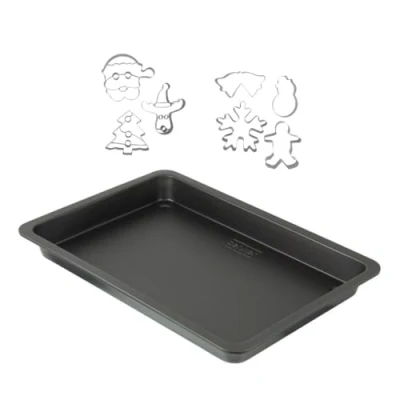 Description: Zenker offers this rectangular baking tray and a set of 7 Christmas cookie cutters to make and bake wonderful Christmas cookies to decorate and enjoy with family or friends LE PETIT +: The baking tray can also be used to cook clafoutis, far-Breton or gratin thanks to its 4 cm high edges, the cutters are perfect for children, they can help you prepare the snack Composition: the cookie cutters are made of stainless steel and the baking tray is made in Germany from steel with a non-stick Teflon coating that allows you to remove the cake from the mould or peel the biscuits easily DIMENSIONS: The dimensions of the cookie cutters may vary by shape, they measure approximately 7 x 9 cm, the oven tray is 42 x 29 cm and the edges are 4 cm high Use: this rectangular baking dish is oven safe up to 230 °C, ideal for baking cookies or cakes, the set with the cookie cutters can be cleaned by hand for a longer service life
