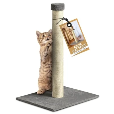 63CM TALL CAT SCRATCHING POST FOR INDOOR CATS - Designed to provide your cat with a sturdy and satisfying scratching surface, this tall post keeps your feline entertained and helps protect your furniture. HIGH QUALITY SISAL ROPE SCRATCHING SURFACE - The vertical scratching post is wrapped with durable sisal rope, offering a natural and effective way for your cat to maintain healthy claws. CARPET COVERED HEAVY BASE FOR STABILITY - Featuring a soft, carpet-covered base, this scratcher is designed to stay firmly in place, even during vigorous scratching sessions, ensuring your cat’s safety. PERFECT FOR CATS OF ALL SIZES - With its tall and sturdy design, this scratching post is suitable for small and large cats, providing plenty of space for stretching and scratching. STYLISH GREY DESIGN FOR ANY HOME - The modern natural grey finish and soft base blend seamlessly with any interior décor, making it a stylish and functional addition to your home.