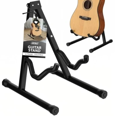 UNIVERSAL COMPATIBILITY - This guitar stand is designed to securely hold electric, acoustic, bass, and classical guitars, as well as ukuleles, making it a versatile choice for any musician. STURDY AND RELIABLE A-FRAME DESIGN - The robust A-frame structure ensures maximum stability, keeping your guitar safe from tipping or falling during use. FOLDABLE AND PORTABLE - Lightweight and foldable, this guitar stand is easy to transport and store, making it perfect for gigs, rehearsals, or home use. NON-SLIP RUBBER CONTACT POINTS - Designed with non-slip rubber contact points to ensure your instrument stays securely in place without shifting or sliding. QUICK AND EASY SETUP - Simple assembly and disassembly make this stand convenient to use, offering a practical and stylish solution for displaying or storing your guitar.