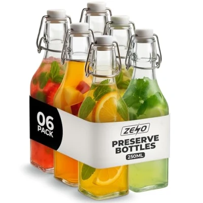 PREMIUM GLASS BOTTLES WITH AIRTIGHT SEAL – Designed with a secure clip-top vacuum seal, these 250ml glass bottles keep contents fresh, leak-proof, and well-preserved, making them ideal for home brewing, oils, sauces, and more. VERSATILE USE FOR LIQUID STORAGE & DISPENSING – Perfect for homemade syrups, infused oils, vinegar, dressings, and alcoholic beverages, these preserve bottles are great for kitchen storage and gifting homemade creations. DURABLE, FOOD-SAFE & REUSABLE – Made from high-quality, lead-free glass, these airtight dispenser bottles are sturdy, reusable, and easy to clean, ensuring long-term durability and safe food storage. VINTAGE STYLE WITH PRACTICAL FUNCTIONALITY – Featuring a classic design with a clip-top stopper, these glass cruet bottles add a rustic charm to kitchens, dining tables, and home bars, while providing practical everyday use. EASY TO CLEAN & DISHWASHER SAFE – These glass bottles with stoppers are quick to clean, resistant to odours and stains, and dishwasher safe, making them hassle-free to maintain.
