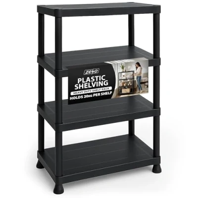ZENO Plastic Shelving Unit 4 Tier Storage Shelves 80KG Total Load Capacity for Home Garage, Kitchen, Shed and Workshop Heavy Duty Stable Frame Easy Tool Free Assembly
