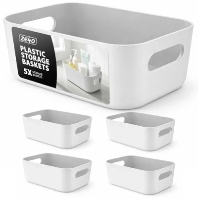 ZENO Plastic Storage Baskets 5 Pack Small Box Basket With Strong Handles for Bathroom, Kitchen, Bedroom (White)