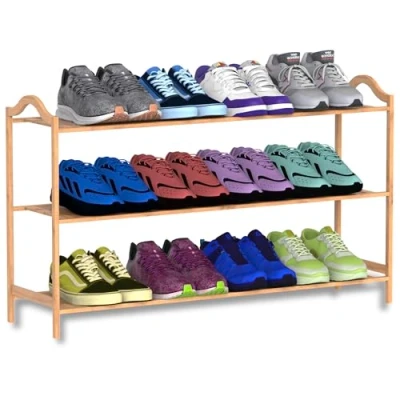 AMPLE 3-TIER STORAGE FOR MULTIPLE SHOES - This wooden shoe rack features three spacious levels designed to neatly hold up to 12 pairs of footwear, including trainers, boots, sandals and slippers. It’s the perfect way to keep entryways, bedrooms or porches clutter-free. NATURAL WOOD FINISH THAT BLENDS BEAUTIFULLY - Crafted from smooth, high-quality natural wood, this rack adds a warm and timeless look to your home. It complements both modern and traditional décor effortlessly. OPEN SLATTED SHELVES FOR AIR CIRCULATION - The slatted design on each tier allows for natural airflow around your shoes, helping to reduce moisture and minimise unwanted odours. Ideal for daily use in busy households. COMPACT DESIGN THAT FITS SMALL SPACES - The slim, vertical shape makes it easy to place in tight spots such as under stairs, in hallways or behind doors. It offers generous storage without dominating the room. EASY TO ASSEMBLE WITH EVERYTHING INCLUDED - Comes with all required parts and simple instructions for a quick and stress-free setup. No special tools or DIY knowledge needed to get started.