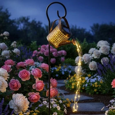MAGICAL CASCADING LIGHT EFFECT - Bring a dreamy atmosphere to your garden with the beautiful LED string lights that cascade from the watering can spout like flowing water. It adds a whimsical, fairy-tale feel to patios, flower beds, or balconies. SOLAR POWERED FOR HASSLE-FREE USE - The built-in solar panel charges during the day and automatically turns on at night, giving you a gorgeous glow without any wiring or electricity costs. It's an effortless way to brighten up your outdoor space. TWO LIGHT MODES TO MATCH YOUR MOOD - Choose between steady and twinkle light settings to suit any occasion. Whether you're hosting guests or relaxing alone in the evening, this feature gives your garden the perfect vibe every time. RUSTPROOF AND BUILT FOR THE OUTDOORS - Crafted from high-quality metal with a protective finish, this waterproof garden lantern withstands all weather conditions so you can leave it outside year-round without worry. QUICK AND EASY TO SET UP ANYWHERE - Comes with a sturdy hook and flexible design so you can hang or display it wherever you like. Whether it’s on a tree branch, shepherd’s hook, or placed in a flower pot, it instantly enhances your outdoor decor.