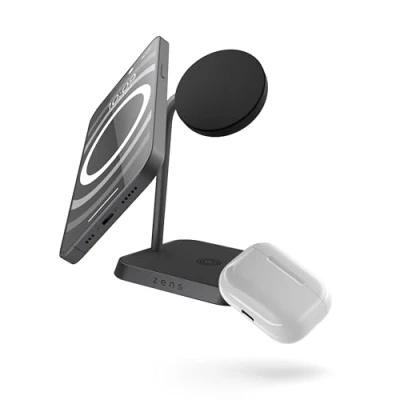 Zens Office Magnetic Wireless Charger 2 keeps your devices organised in one place; the magnetic holder ensures accurate placement and charges your iPhone, while the base wirelessly charges your AirPods. The charge magnetic holder ensures accurate placements and can be used both in Portrait and Landscape; while charging in Landscape, the Apple Stand Bymode will be activated, providing easy access to customizable widgets like the alarm clock, photo frame, calendar, or weather forecast Crafted from high-quality Zinc, Alloy for durability and elegance, this charger adds a sophisticated touch to any nightstand or desk; its robust construction ensures it stands up to daily use, making it a reliable accessory for everyday charging needs Zens Office Magnetic Wireless Charger 2 is MagSafe compatible with fast Wireless charging speeds up to 15W and supports Apple's 7.5W fast charging; airPods charging is also supported up to 5W Zens Office Magnetic Wireless Charger 2 is designed for seamless magnetic alignment and attachment with any case, iPhone and AirPods with MagSafe technology Compatible with iPhone Air/17/16/15/14/13/12 Series, AirPods (3rd & 4th Generation), AirPods Pro (2nd & 3rd Generation). Works with most MagSafe cases (