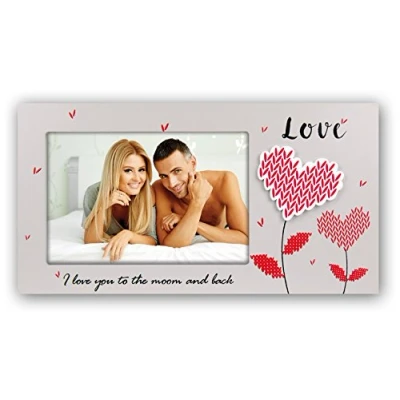 Wooden photo frame with LOVE motif and heart decoration. holds one 13x18cm photo designed for table top display
