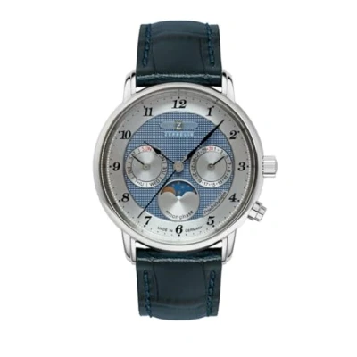 Series: Friedrichshafen - Made in Germany - Polished stainless steel case - Elaborate handmade case with the typical Zeppelin rings on the edge of the case Pressed stainless steel base - Case diameter: approx. 36 mm. Case height: approx. 10 mm. Display: dark blue hour, minute and second central Blue dial with "Clus de Paris" embossing and black Arabic numerals - slightly curved mineral glass Knurled stainless steel crown, date display at 03:00, moon phase at 06:00, weekday at 09:00, Swiss quartz movement Ronda 706.1, splash-proof 5 ATM (test pressure according to DIN standard 8310) Dark blue crocodile look leather strap with silver-coloured stainless steel pin buckle. Weight: approx. 43 g. Strap lug: 18 mm. Arm circumference: approx. 15 cm to approx. 19 cm. Total length: approx. 22.5 cm